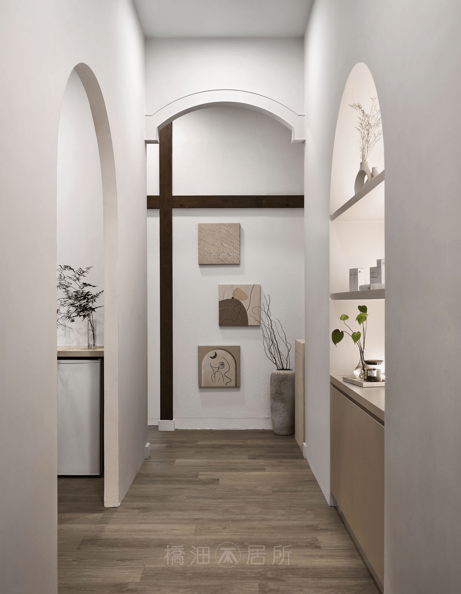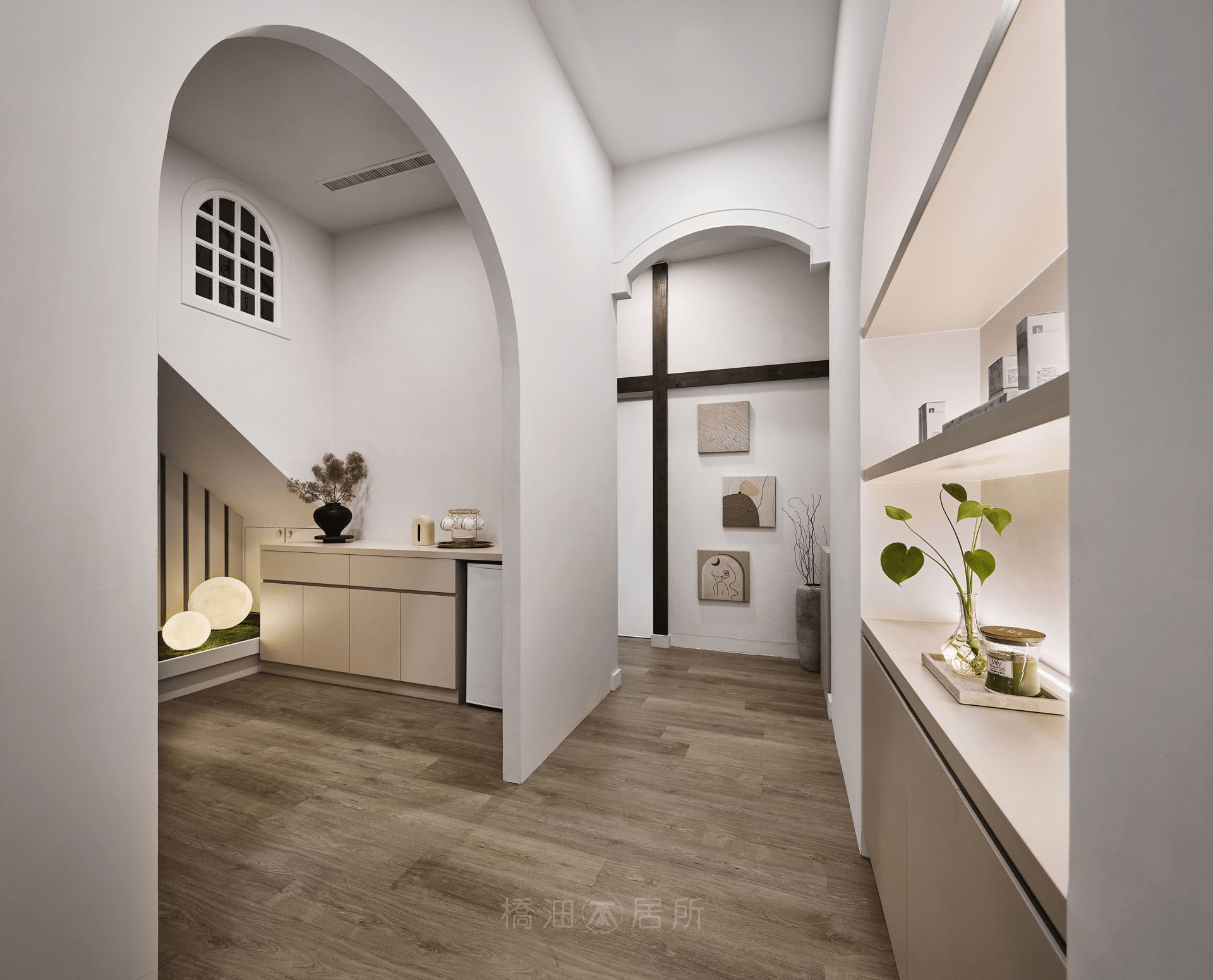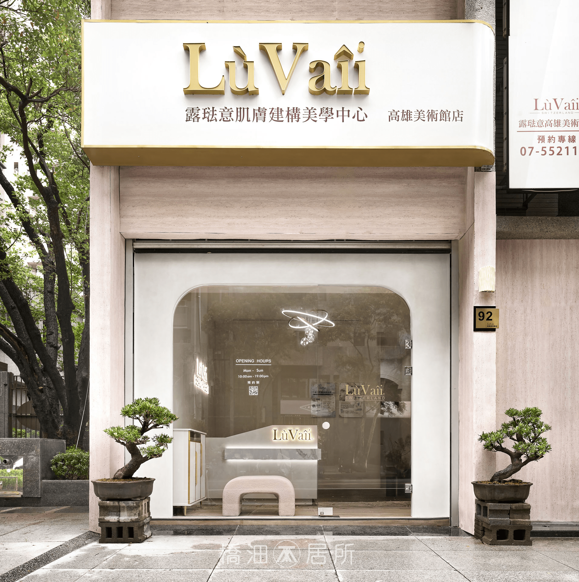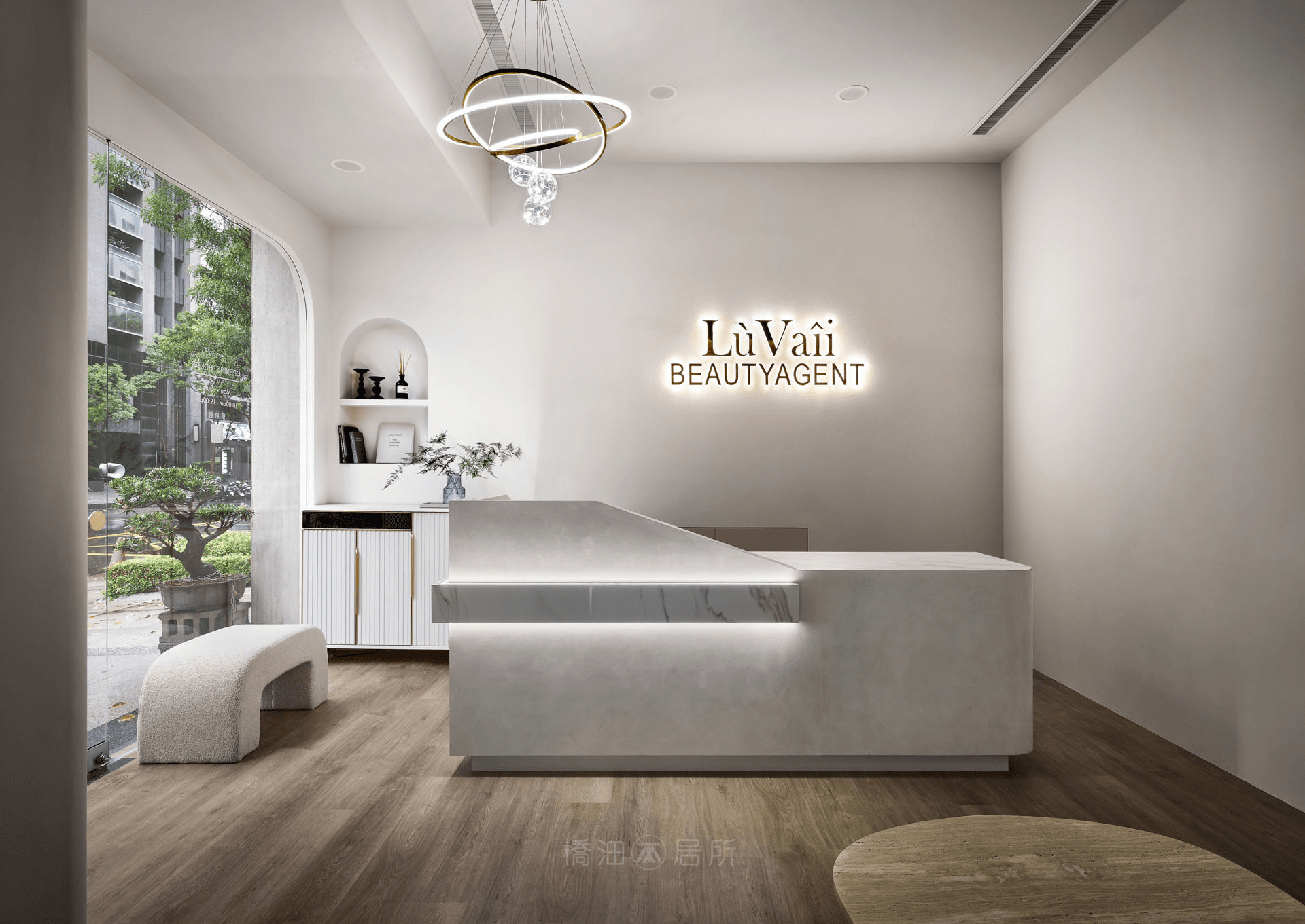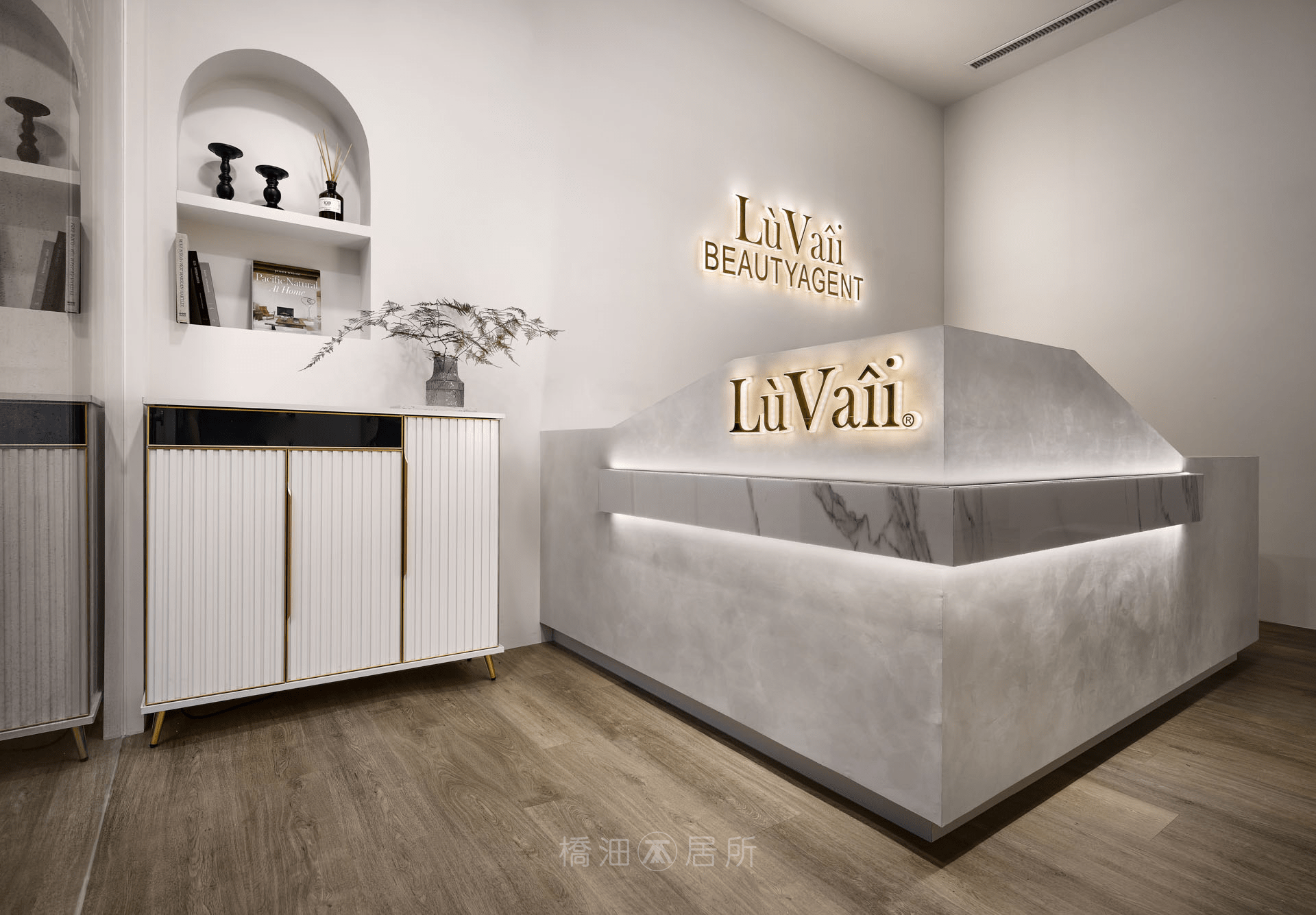本案以淺色基調,結合灰冷藝術漆,賦予空間質感的同時,藉淡色調和緩石質冰冷感,接著透過暖色主燈、線燈與間接照明搭配層次,創造出柔和且不失專業的視覺體驗;整體色調注重冷暖平衡,用獨特設計語言傳遞品牌重視細節、關懷客戶之理念。