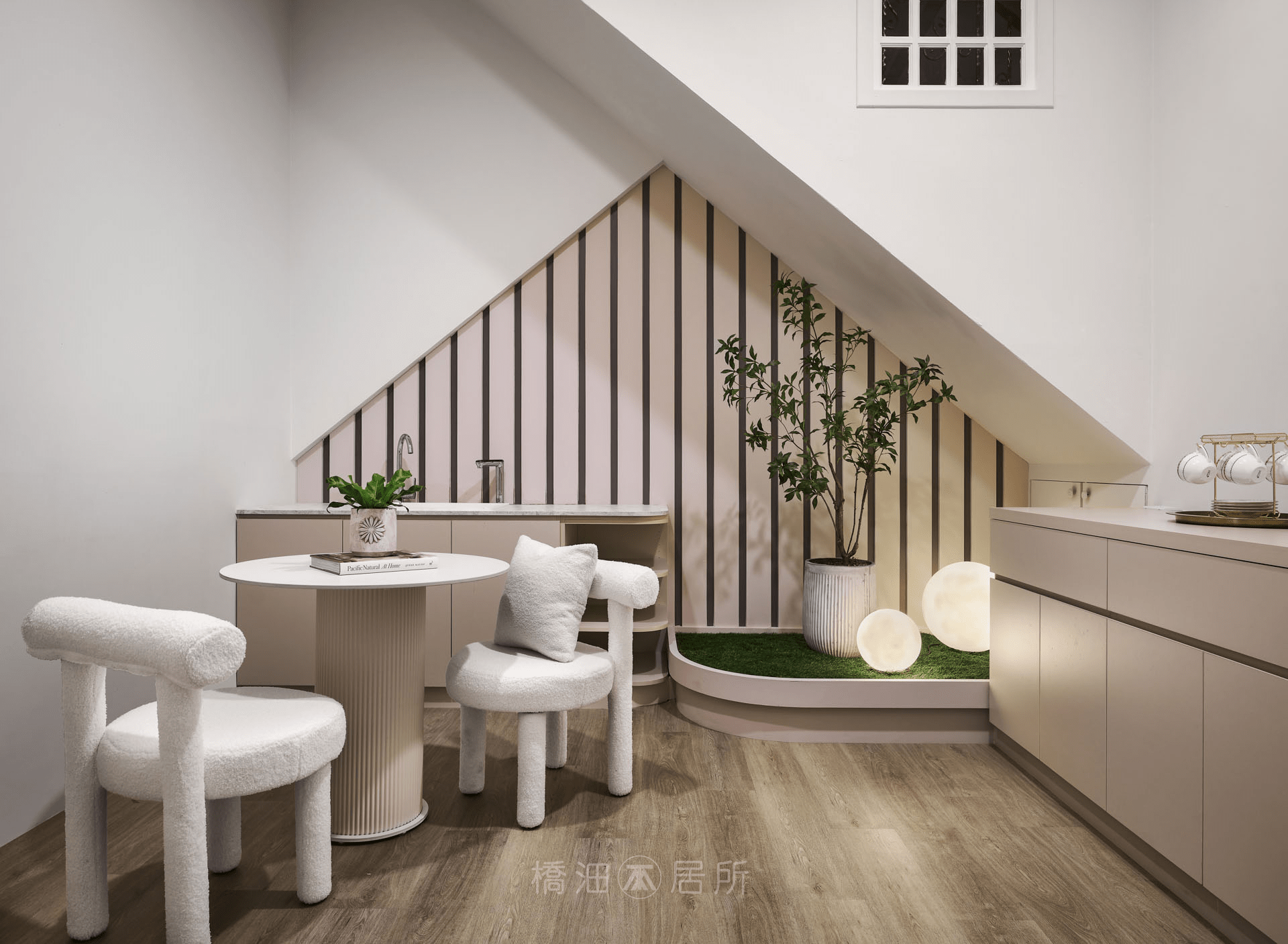 下規劃了VIP洽談區,善用軟裝及鍛造門隔間,柔化了樓梯下帶來的壓迫感,成功營造出氛圍感精緻的洽談空間,讓賓客及業者能夠在舒適隱密的空間中盡情交流。